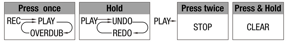 Power on the Dual Loop Stereo pedal, rotate the VALUE knob to select an empty memory from 01 ~ 99, then you can press the foot switch to record/play/dub your loops. You can also hold the foot switch to UNDO/REDO/CLEAR.