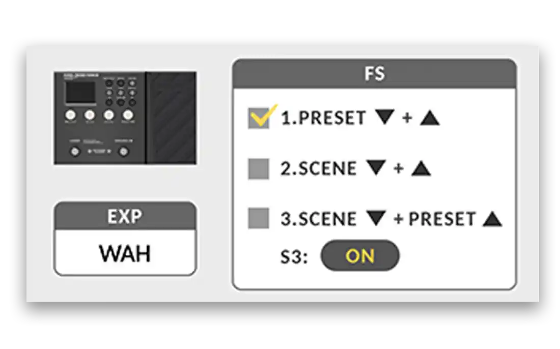 Preset Up and Down: Simplify preset navigation, allowing quick switches between presets. Scene Up and Down: Navigate through three scenes within a preset for layered sound changes. Scene Down and Preset Up: This hybrid setting lets you access different presets while managing scenes within them. Additionally, you can deactivate Scene 3 for straightforward A/B sound switching between Scene 1 (S1) and Scene 2 (S2).